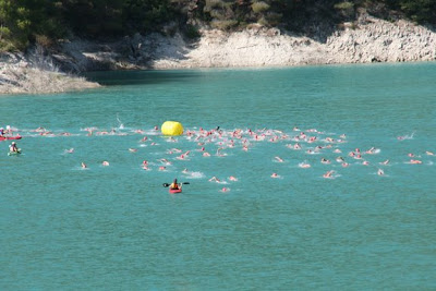 Salimos a la 5 y media con el objetivo de recorrer los 2400 metros mas o menos de que constaba la prueba. Un circuito señalizado por boyas por todo el pantano. Salí a buen ritmo y bien situado, en un lado, y pronto me puse delante.Miré atrás un par de veces y aunque no iban muy lejos si podia ir algo más relajado que en otras travesías... menos mal porque tuve varios problemas....